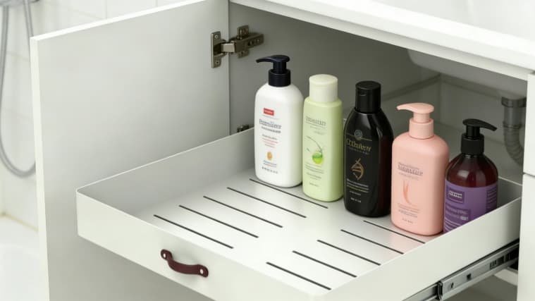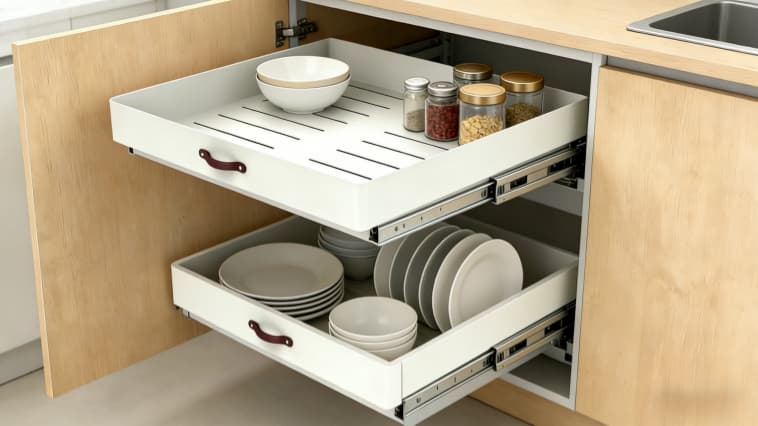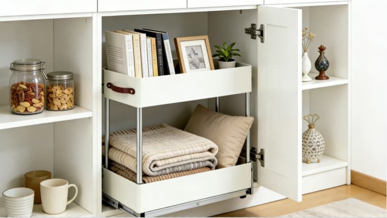 White metal pull-out cabinet storage tray designed to improve cabinet accessibility and space utilization. Smooth sliding and ventilated structure make it suitable for modern kitchen and bathroom storage.